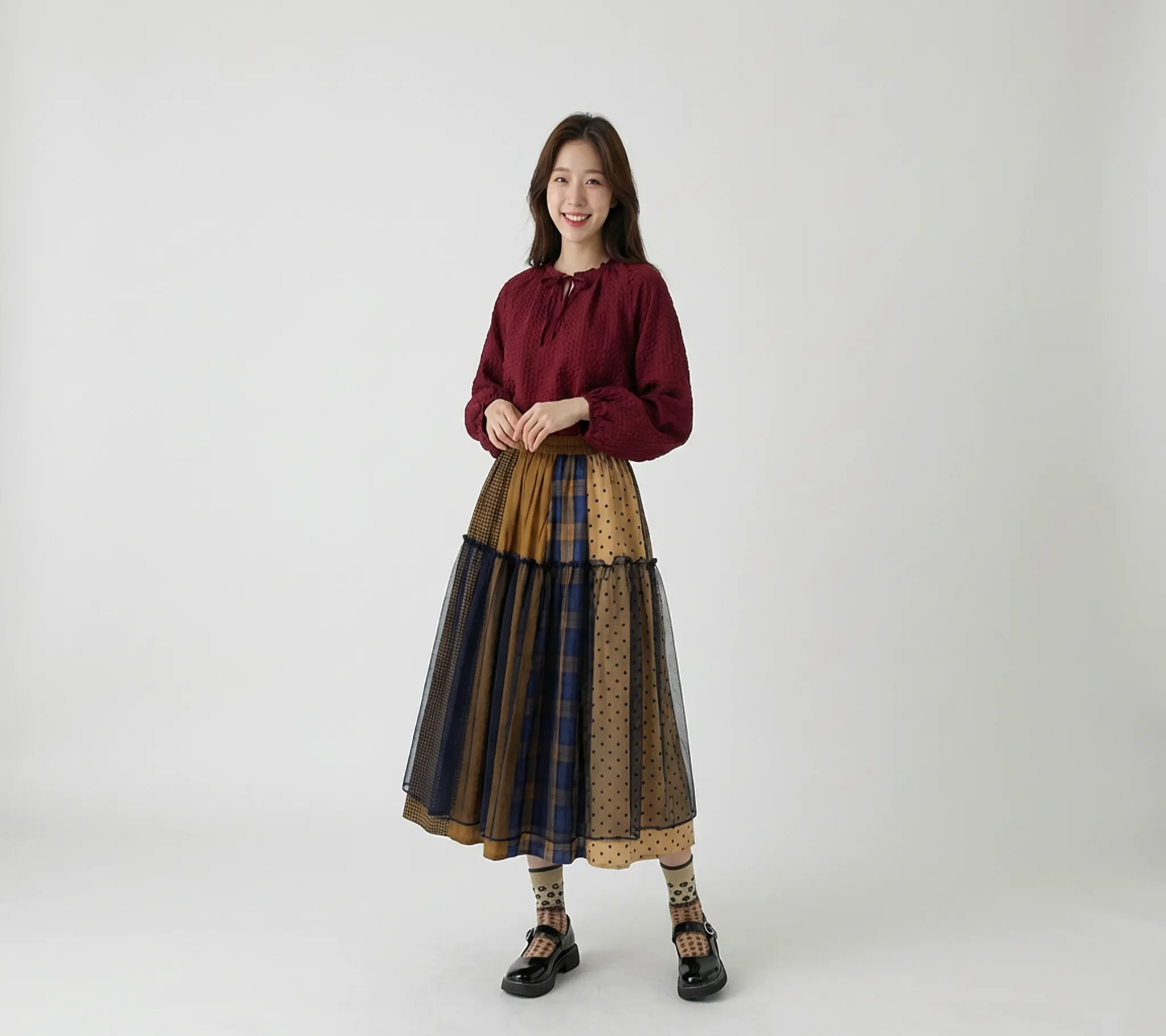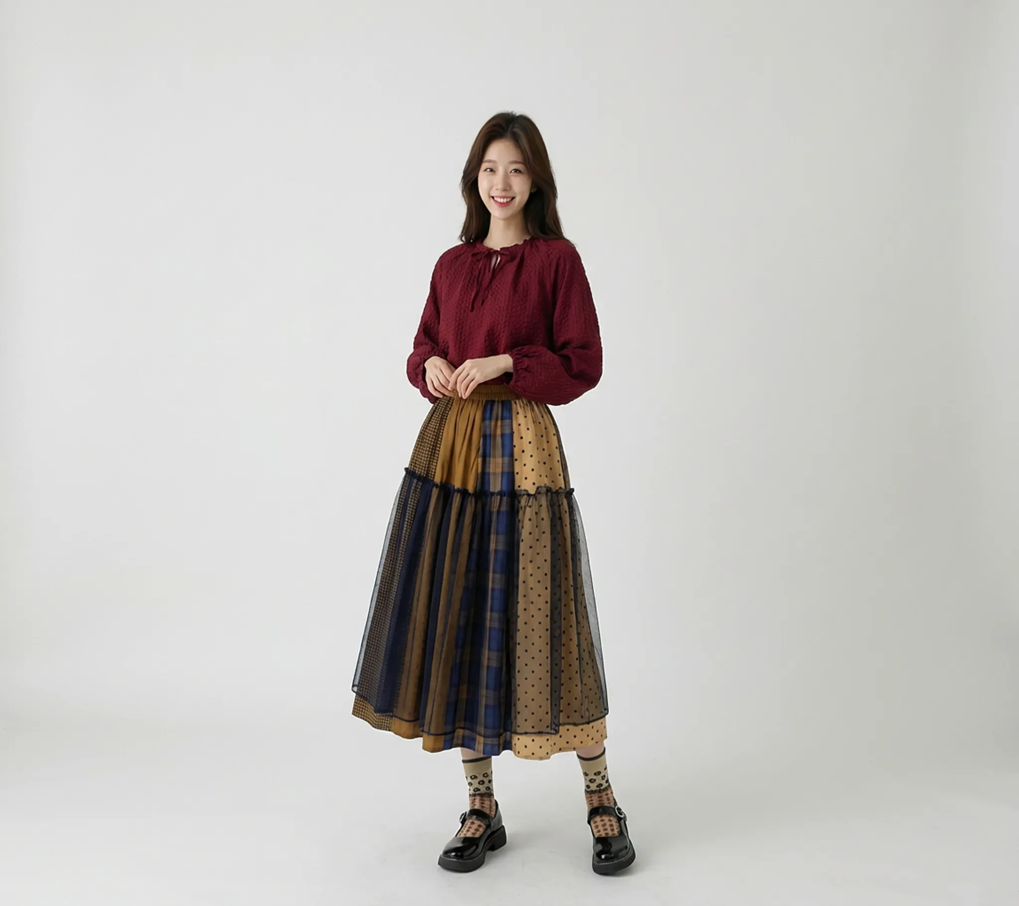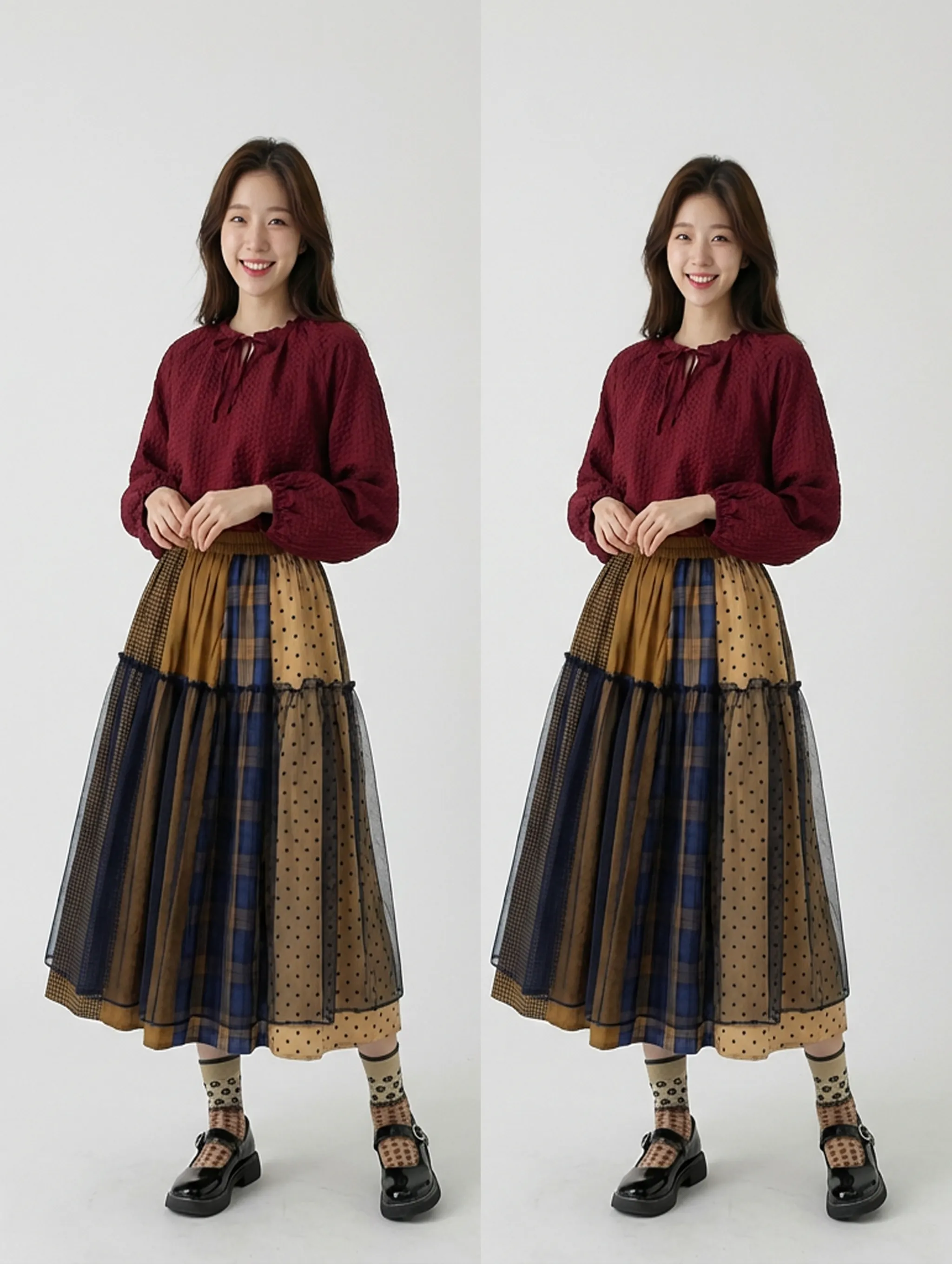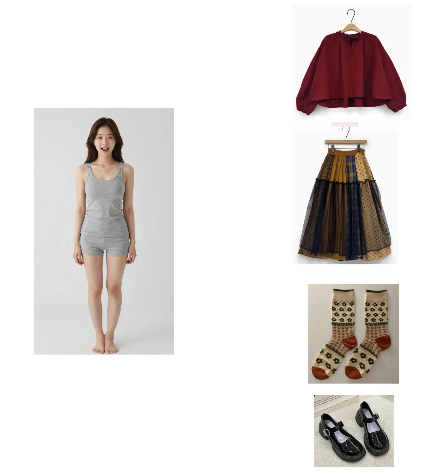 Use the model on the left and keep her facial proportions completely intact with absolutely no distortion. Dress her in the top, bottom, socks, and shoes shown on the right, and pose her in a refined, elegant stance. Her expression should be bright and happily smiling. The background should be a plain white backdrop, and the shadow on the floor should be rendered as lightly as possible. The final image should have an iPhone-like low-resolution aesthetic with slight noise and shallow depth of field for a natural, realistic appearance.