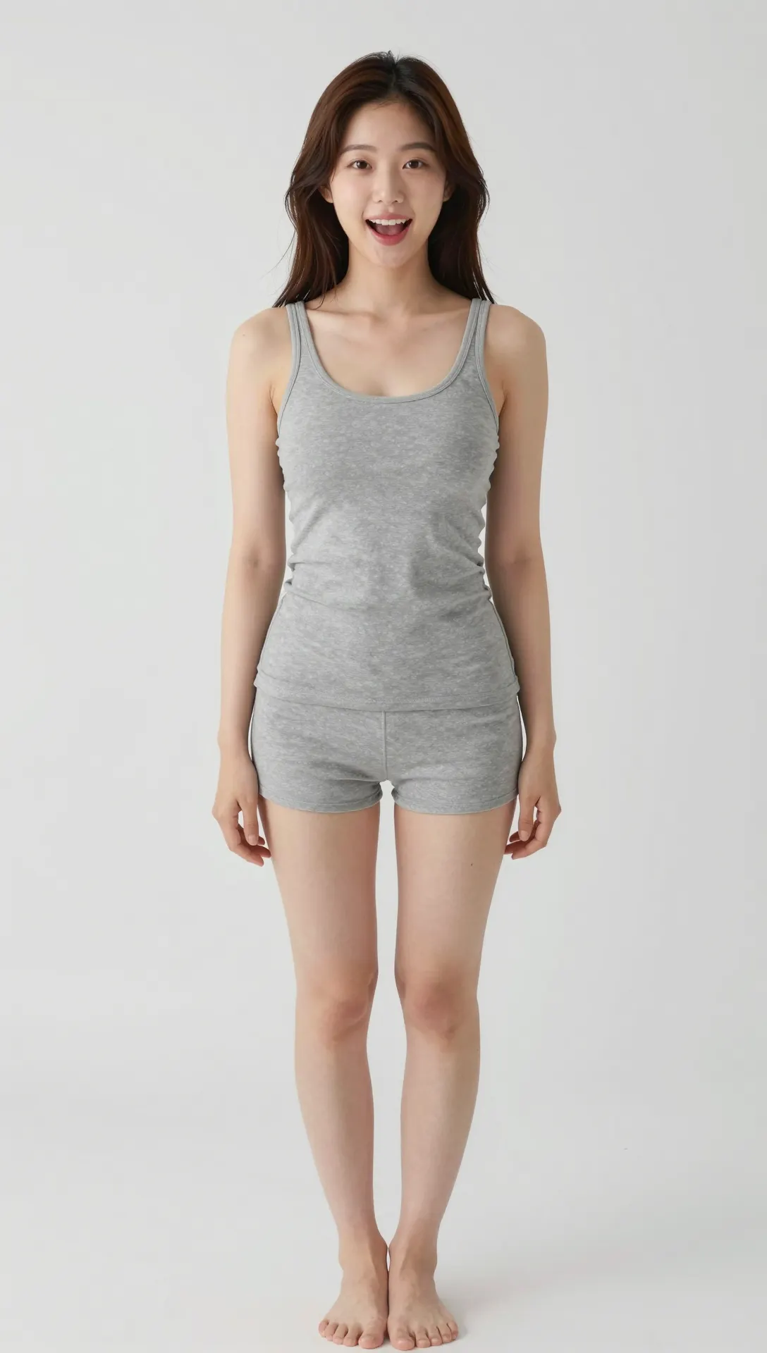 전신, 20대 초반 한국 여성, 귀엽고, 발랄하고 생동감있는 표정. 정면을 보고 서있기. 짙은 갈색 머리. 밝고 깨끗한 복숭아 피부. 어떤 악세사리도 착용하지 않음. 회색 나시와 회색 반바지 착용. 맨발. 배경은 흰색 스튜디오 배경. 아이폰으로 찍은듯한 자연스러운 조명과 약간의 노이즈, 심도표현 추가.